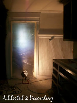 After a few months of delays with the contractor, the work finally started. Things were going along fine–new updated doors had been made for the cabinets, the painter was taping everything off to get ready to spray the paint on the cabinets, etc.