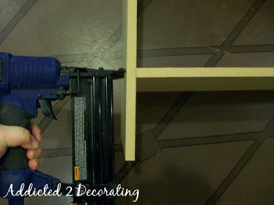 I stood the piece on its side edge, and lined up the shelf piece (measures approx 26″ x 13″) just under the pencil line on the bead of glue. Using my brad nailer, I nailed the shelf in place.