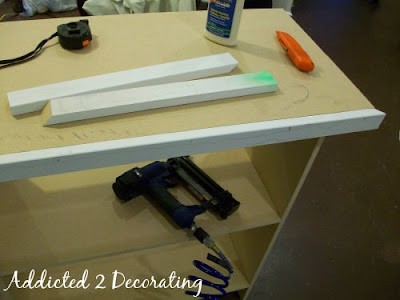 With the front and side pieces glued and nailed, I filled in the cracks and nail holes with wood filler. When it was really good and dry, I sanded it smooth, primed the top, and then painted the tops.