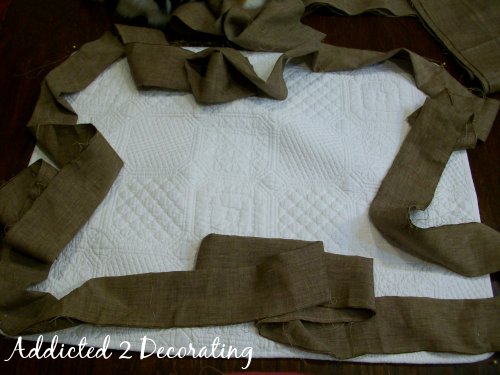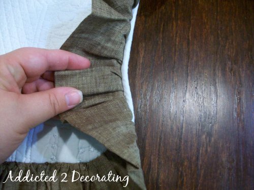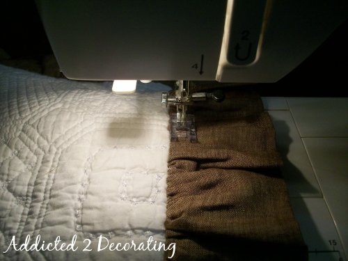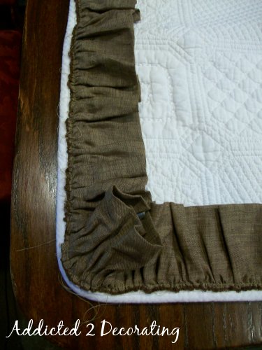 That was the case with the quilted pillow shams I used in J & A’s bedroom. I bought plain quilted white shams from Marshall’s, but I wanted to add a little something to beef them up a bit, make them unique, and to tie them in with the gorgeous linen bedskirt, so I added a ruffled edge.