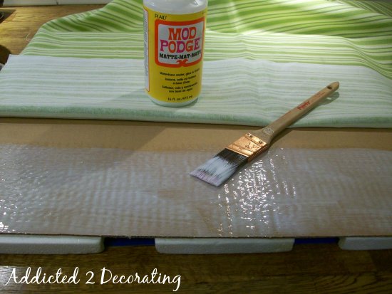 The first step was to apply the fabric to the cardboard backing. I did this using Mod Podge. Now that mine is done, I can tell you that I would NOT recommend stripes. Even though I tried my hardest to get the lines straight, they’re not perfectly straight, and it’s driving me a bit crazy.