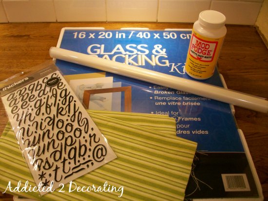This is really quite simple. I’m sure you could put this together without my instructions, but here goes anyway. I used a glass and backing kit from Michael’s, Mod Podge, a paint brush, leftover frosted window film (and the tools needed for that), fabric, and puffy stickers found in the scrapbooking section of Michael’s.