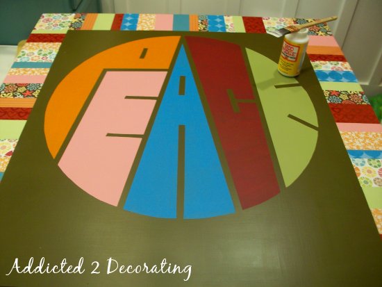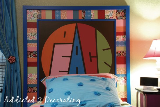 Caroline specifically wanted the word “peace” on her headboard, but this design could be easily adapted for any young girl’s room. Literally any color(s) of paint and paper could be used, the middle painted design could be monogrammed initials rather than the word “peace”. Just imagine more subtle colors used with a monogram like this painted in the middle…