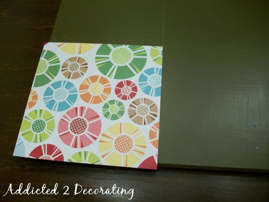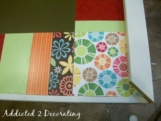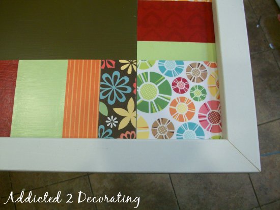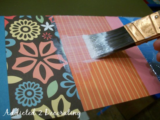 After the paper was adhered to the headboard, I went back over the paper with two coats of Mod Podge.