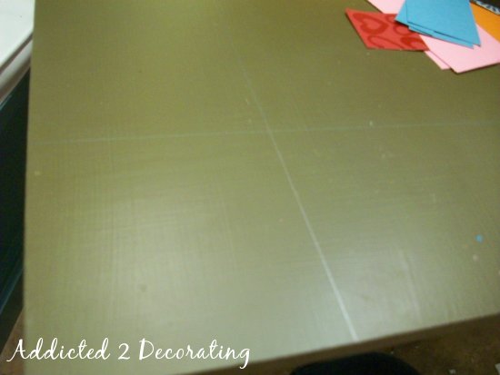 When the middle design was dry, I marked off a five-inch border on the two sides and the top of the headboard. This indicates where the paper would be decoupaged. For the corners, I cut 5″ X 5″ pieces of paper. For the rest, I cut the paper 5 inches wide, but cut them at random lengths.