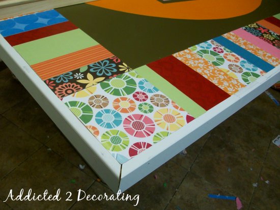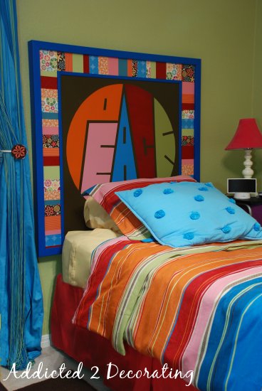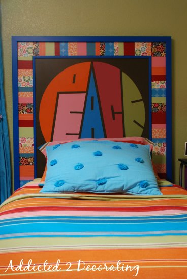 It seems like this week has a recurring theme–decoupage! On Tuesday, I shared with you a chest of drawers that I recently painted and decoupaged for a pre-teen girl named Caroline. Now I’ll show you the crazy, colorful, out-of-the-box headboard that I made for her room. Ready?