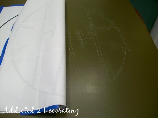 I then taped the design onto the headboard, chalk side down, and used a pencil to trace over all of the lines. The chalk transferred the design to the headboard.