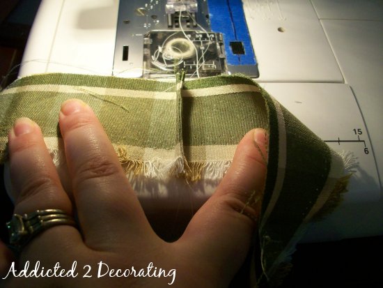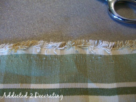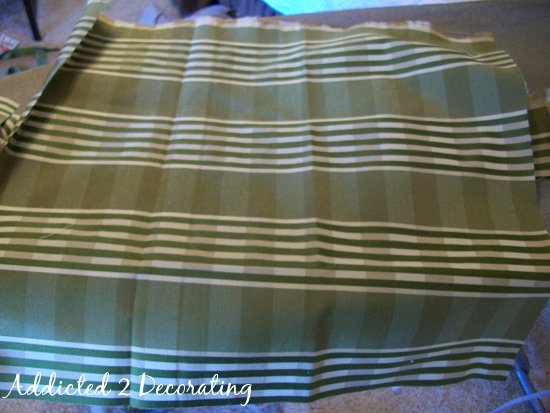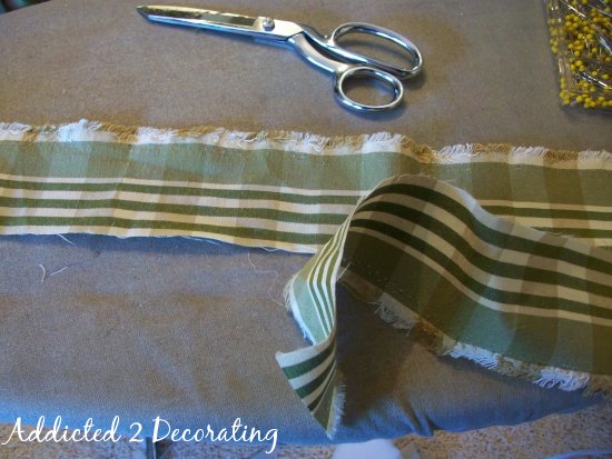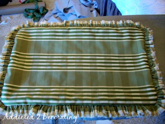 I needed a pillow to go in the chair that I reupholstered. I found a scrap piece of fabric that I could use, and I wanted to add a fringe trim, but didn’t want to spend any more money. So I searched for a creative substitute, and found it in the trash! I had cut off several yards of selvage from the fabric, and it had a cute little fringy edge, so I decided to gather it up, and use it as the decorative trim on the pillow.