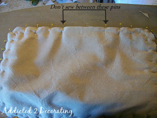 | Then I was ready to add the pillow back. I lined up the edges and the corners, and then pinned all the way around. |
