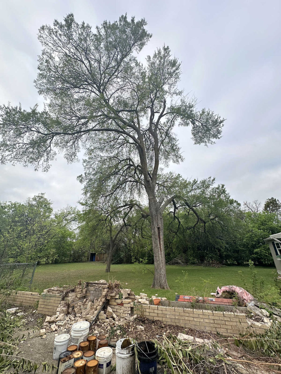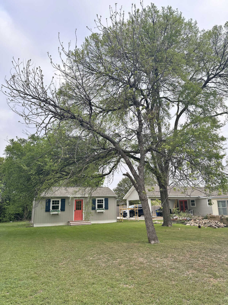 On Tuesday, when I shared about knocking down our back yard brick fireplace and planters (which you can read about here), someone pointed out the failing health of the tree that is just beyond the patio in our back yard. It’s a very tall live oak (I think) and it has been a problem for the last several years. This thing drops limbs pretty regularly, and especially when we get heavy rain or winds. It’s definitely a concern, and it’s clearly not in good health. Last year, we had a woodpecker that spent a great deal of time each day pecking away at this tree, so that was another indication to me that this tree might need to go sooner than later.