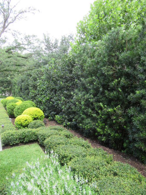 The description of that picture called that area with the low, round shrubs a “boxwood cloud”, and I’ve never wanted anything more. 😀 It’s made up of three different plants — sunshine ligustrum (which is one of my absolute favorite plants because of the bright green color), boxwood, and dwarf yaupon (which is also all over my landscape design). So now I absolutely must find a place for a “boxwood cloud”. And then the hedge “fence” is created with Japanese yew (clearly not the dwarf type) and N.R. Stevens hollies, which is actually what my mom ended up buying yesterday for her specific area in her yard. I loved the shiny deep green leaves of the N.R. Stevens holly. So now, after seeing that picture above, I’m dreaming about planting a row of alternating Japanese yew and N.R. Stevens hollies along the back fence of our property for a natural privacy “fence”.