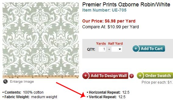 Now I need to know the vertical repeat of the pattern on the fabric. Most websites and fabric retailers have this information available.