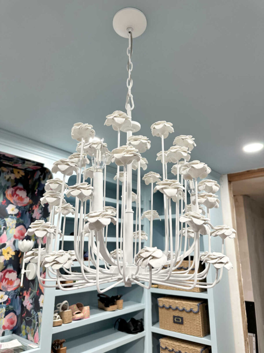 And I hung it as low as I could get away with (60 inches from the floor, which is the lowest that a dining room chandelier should hang with an 8-foot ceiling) so that more details of the flowers could be seen. And I’m so short that 60 inches above the floor, hanging over an island, is plenty high without it being in my way.