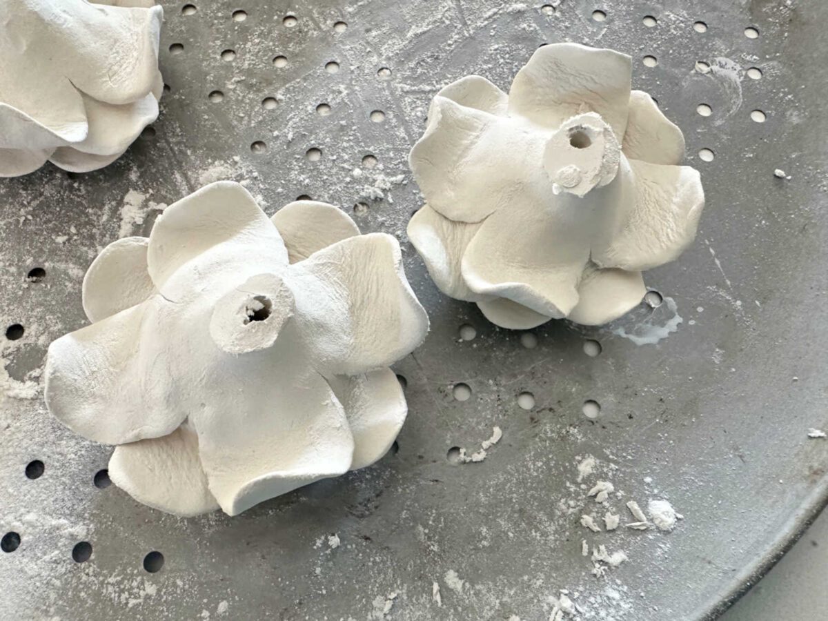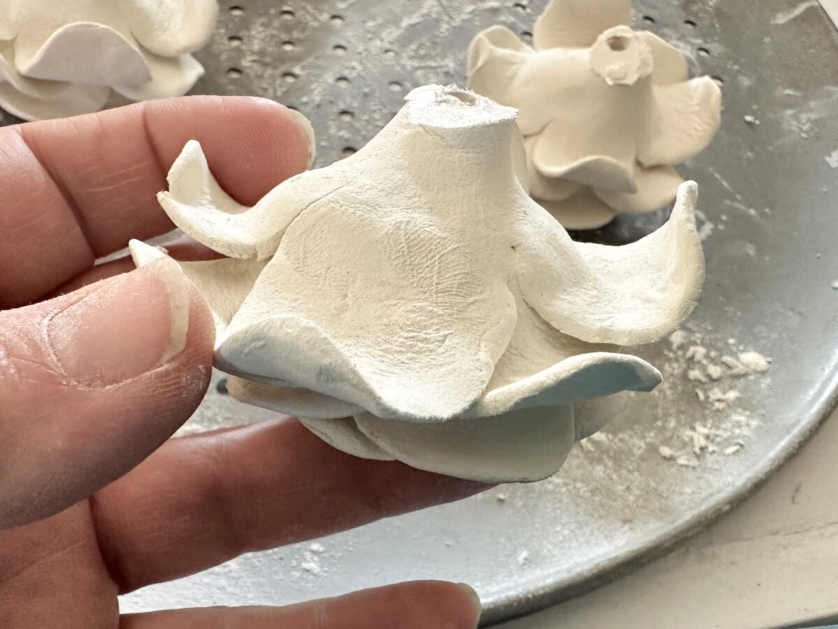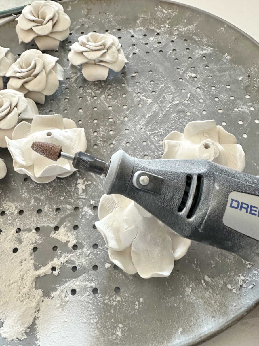 I started out sanding them by hand using 100-grit sandpaper but quickly realized that would take way too long to get through all 48 flowers. So I ended up using my Dremel with this little sanding/grinding attachment. It made very quick work of removing those flat bases from the clay flowers.