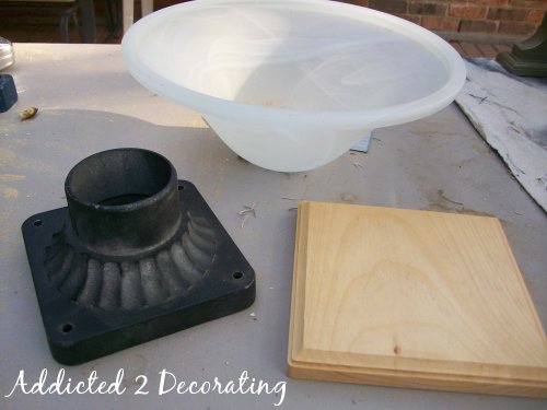 I wasn’t really sure what it was, but I liked the shape, so I snatched it up. Then I headed to JoAnn Fabrics and picked up a decorative piece of wood for $1.80 (with a coupon). The alabaster-ish light globe thingy I already had from a ceiling fan that broke, but I saw similar items at ReStore.