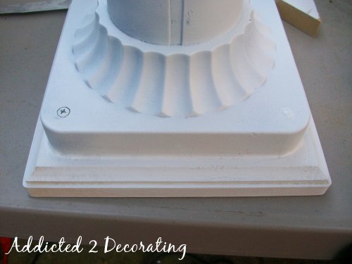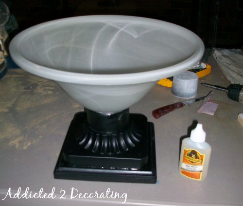 Using the same glue, I attached the glass piece to the base. I used the foaming/expanding Gorilla glue. Since there was so little of the base touching the glass globe, I wanted it to be very secure.