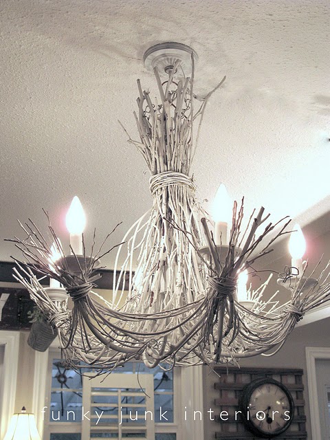 First up, Donna over at Funky Junk Interiors did this amazing twig chandelier. I would imagine that took TONS of patience, but definitely worth the effort!!