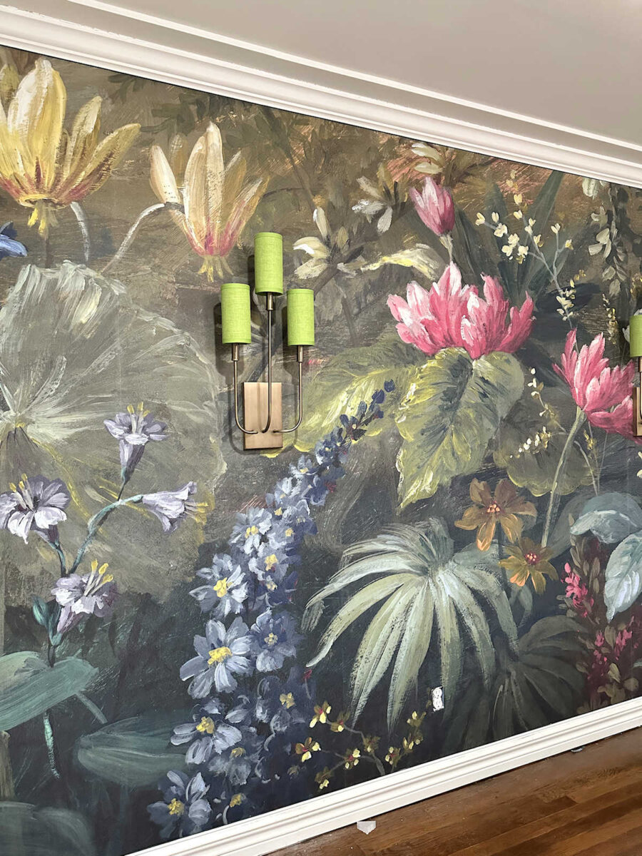 It’s a beautiful mural, but I’m confused about something….on one hand you cut it to get just the right foliage placement but now you want to cover it with mirrors and such. You say you “need something between the sconces.” Well, you HAVE something there—2 beautiful flowers! And if you decide on covering them with a mirror then find the perfect replacement sconces, that could throw everything off. I would take a deep breath, hunt for sconces or shades and let the mural shine. I would however paint or cover the light switch with the paper to make it blend in.