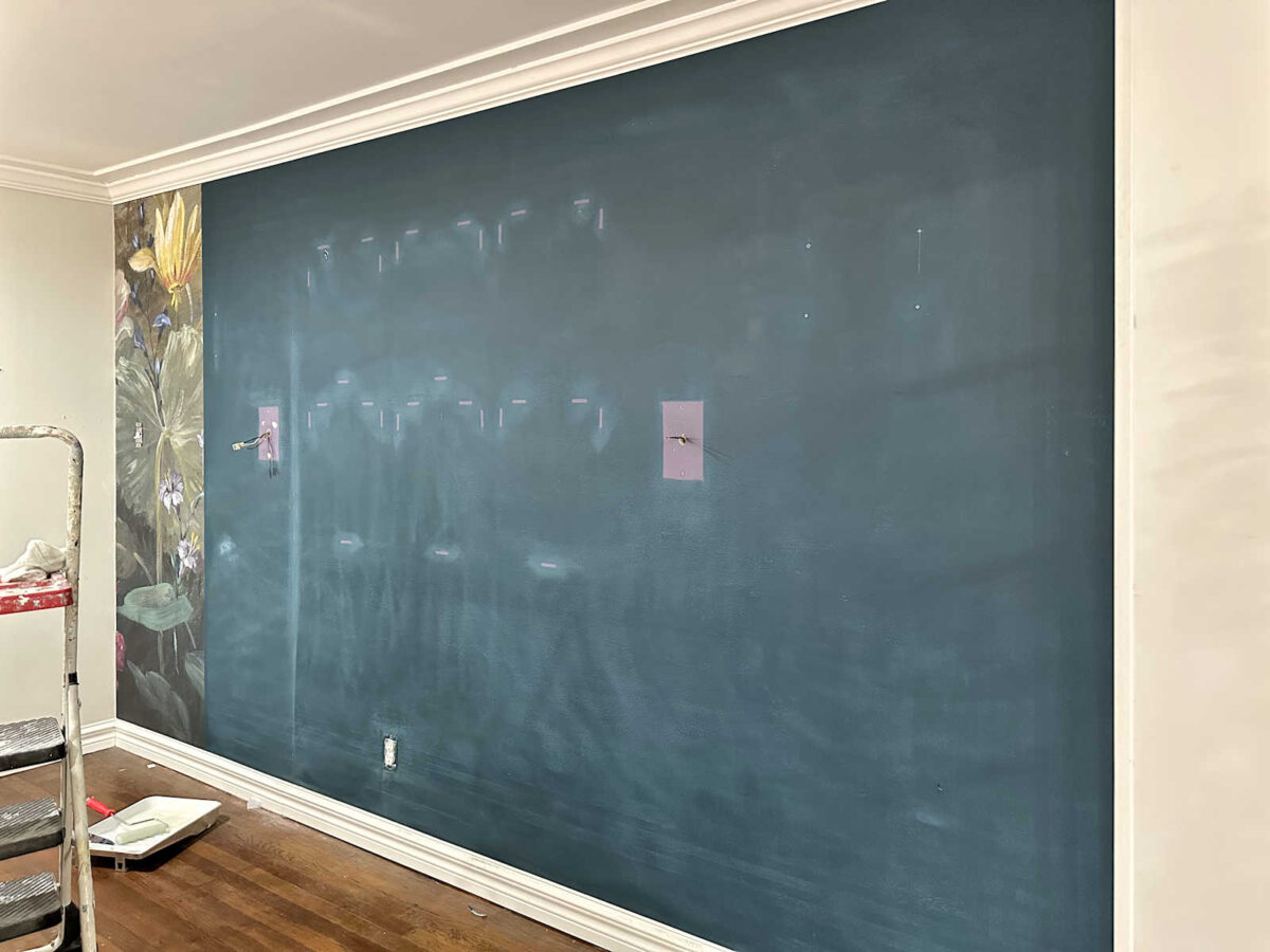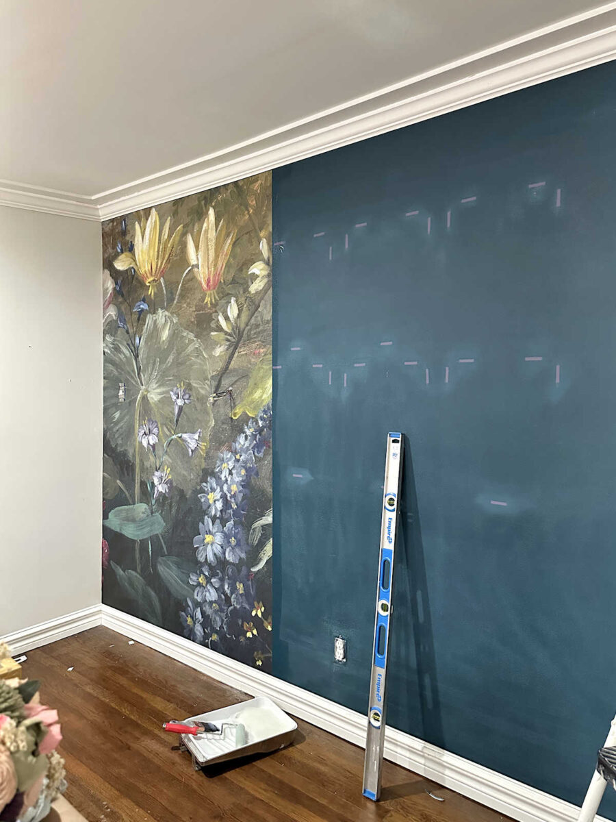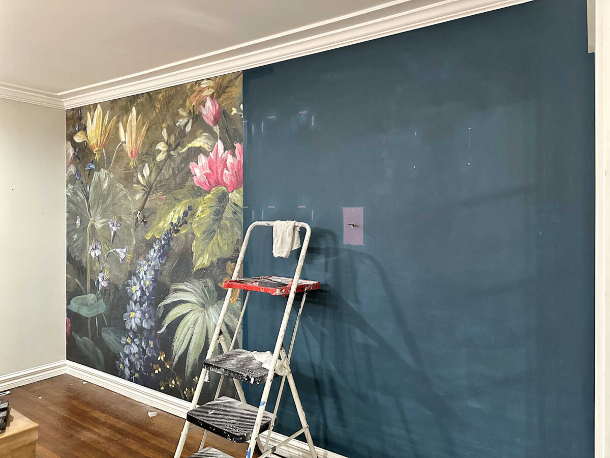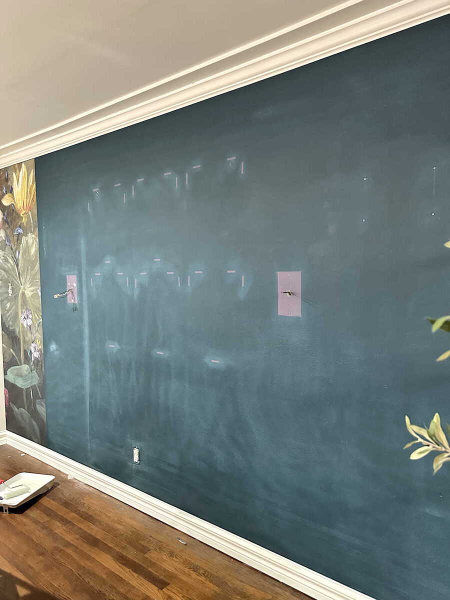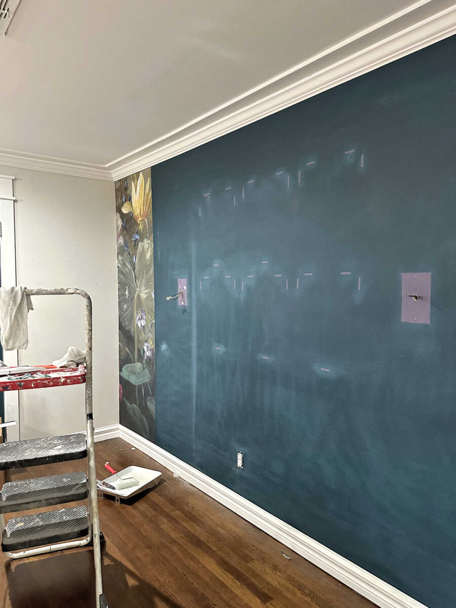 I also had some paint drips on the wall that I hadn’t even noticed before since I had painted this wall in a dark matte finish. But I wanted to get all of that smooth before installing the mural.