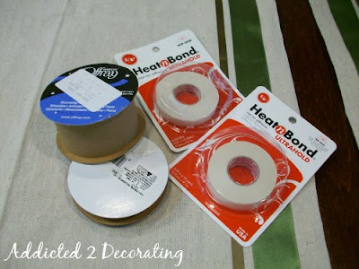 The process was fairly simple. I just used two sizes of ribbon (1 1/2″ and 3/8″) in two different colors, and then adhered them to the fabric with Heat N Bond. All you need is an iron–no sewing required!