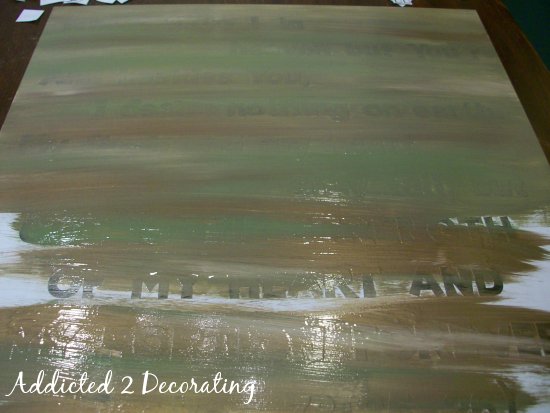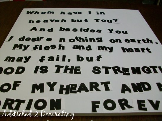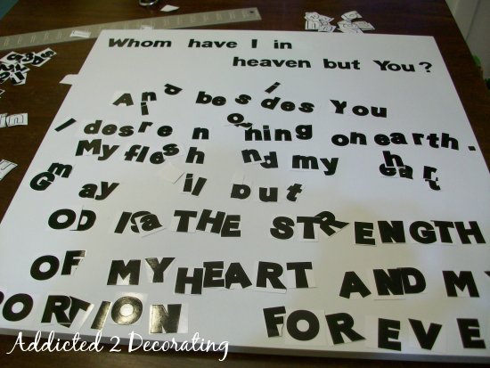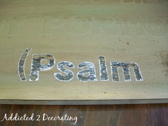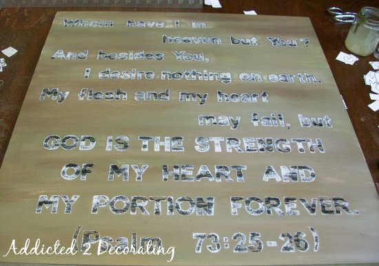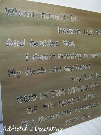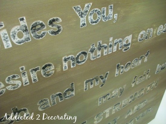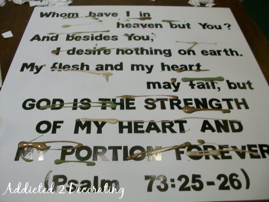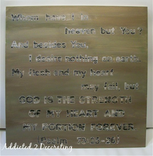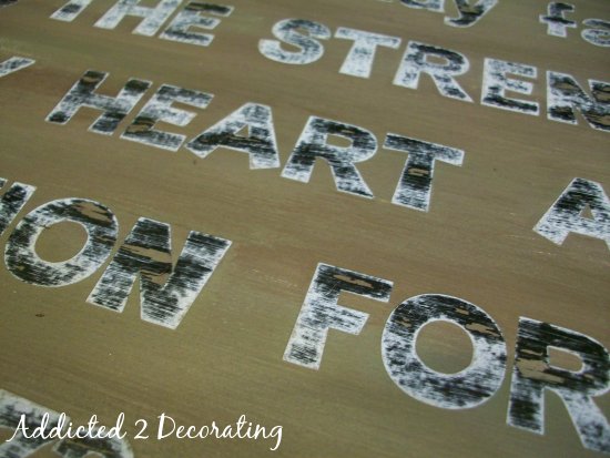But let me show you the final project that I worked on. I had asked Alice if she has a favorite Bible verse, so I took that and made artwork out of it. I wanted it to be somewhere between subway art and an old rustic sign. Here’s how it turned out…