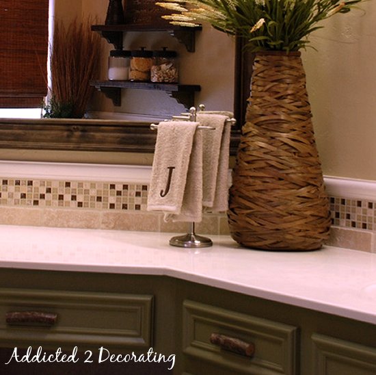 1. Use high-style, high-dollar items sparingly. In this bathroom, I used a really pretty glass/marble mosaic tile.