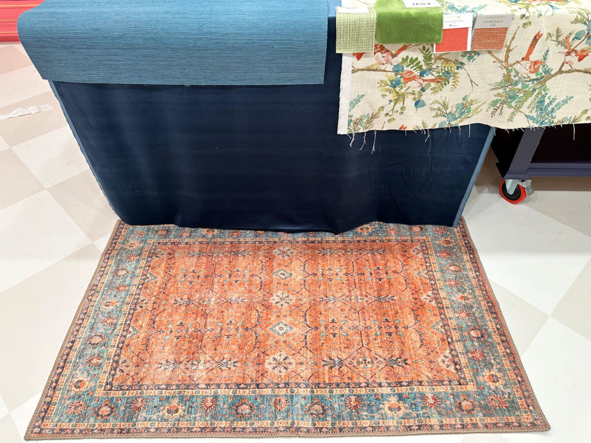 You may be surprised, but the second one that I ruled out was the first rug — the orange and teal. I really liked the rug, but it appears overall dark to me. There’s no lightness to it. It has a heaviness to it that doesn’t feel right to me, and I think that’s because of the teal border and the fact that there’s virtually no light neutral color in it — no cream, no off-white, no beige. Anyway, I couldn’t shake that heavy feeling that it gives me.