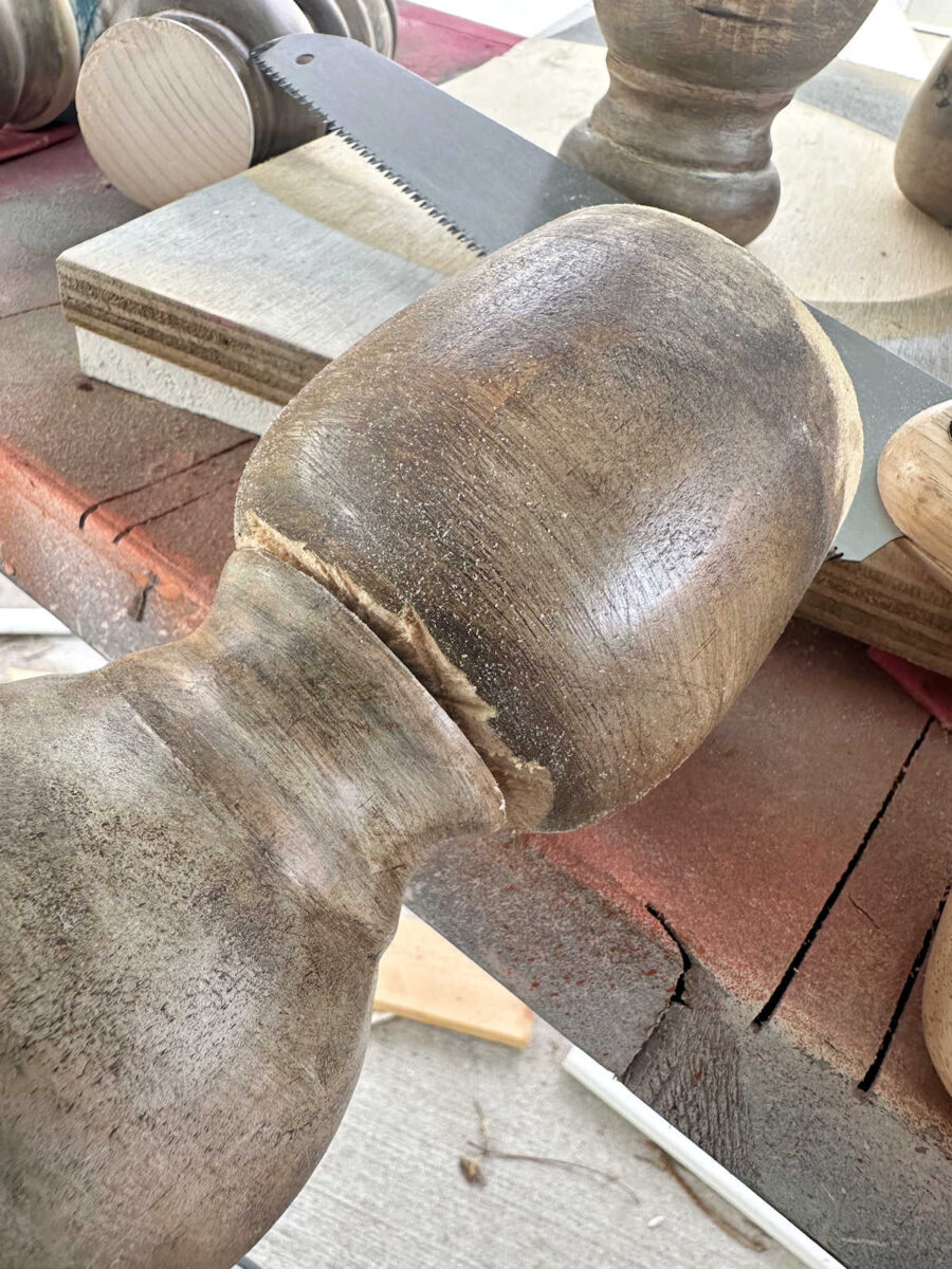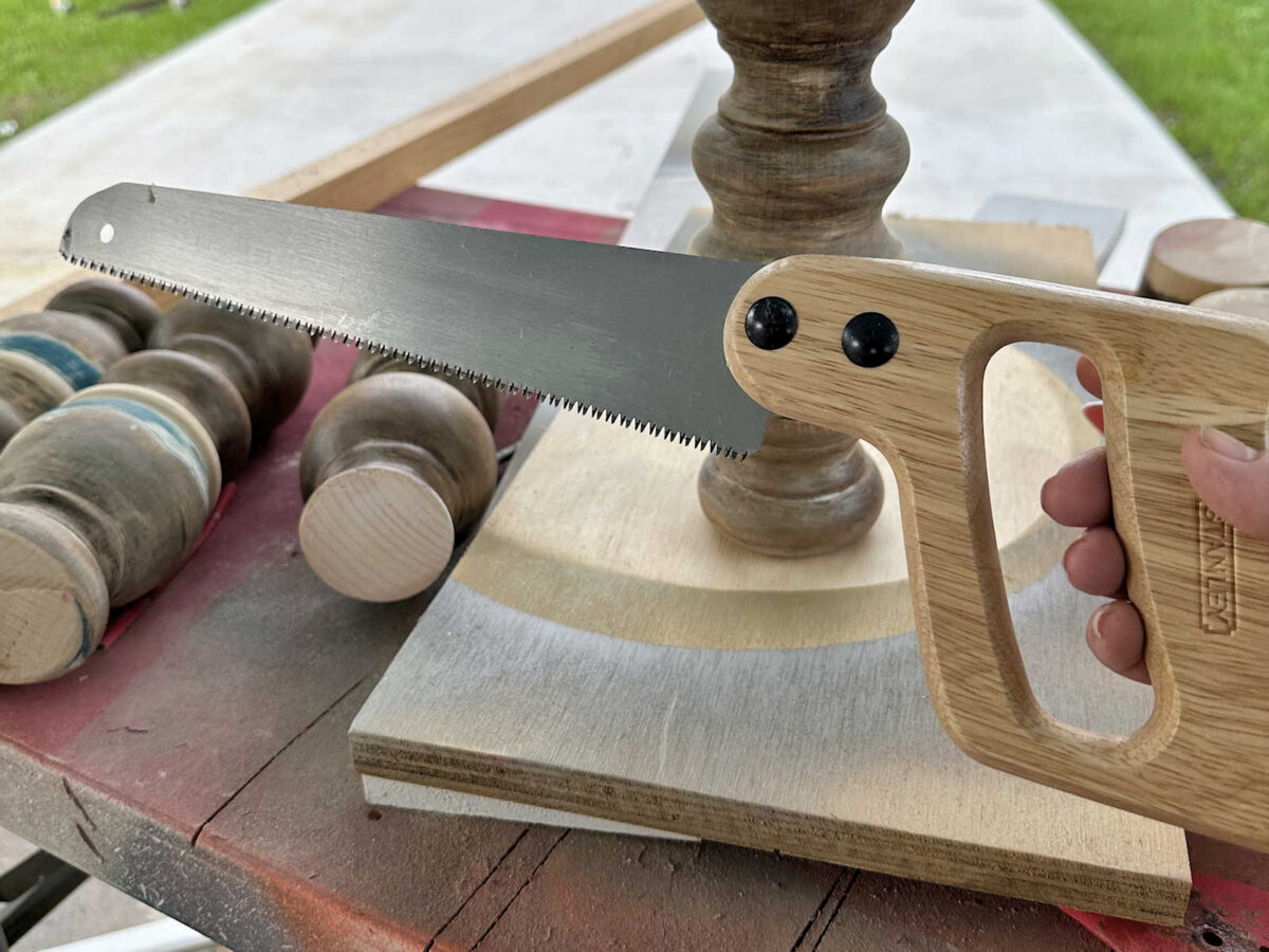 But yesterday, I had another idea. Instead of adding a block lower on the legs, I decided to add a block to the top, and I have an idea for how to secure them to the upper part of the table that I think will be very secure. But first, I needed to replace the top turned portion of the legs with a block. And this time, instead of using my miter saw to cut them, I decided to use a hand saw so that I could have more control over it and cut them as straight as possible.