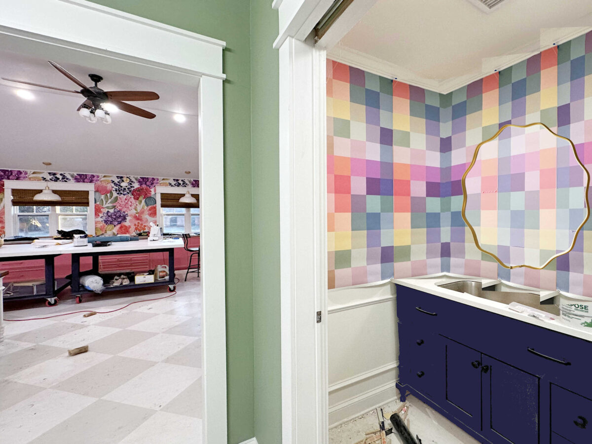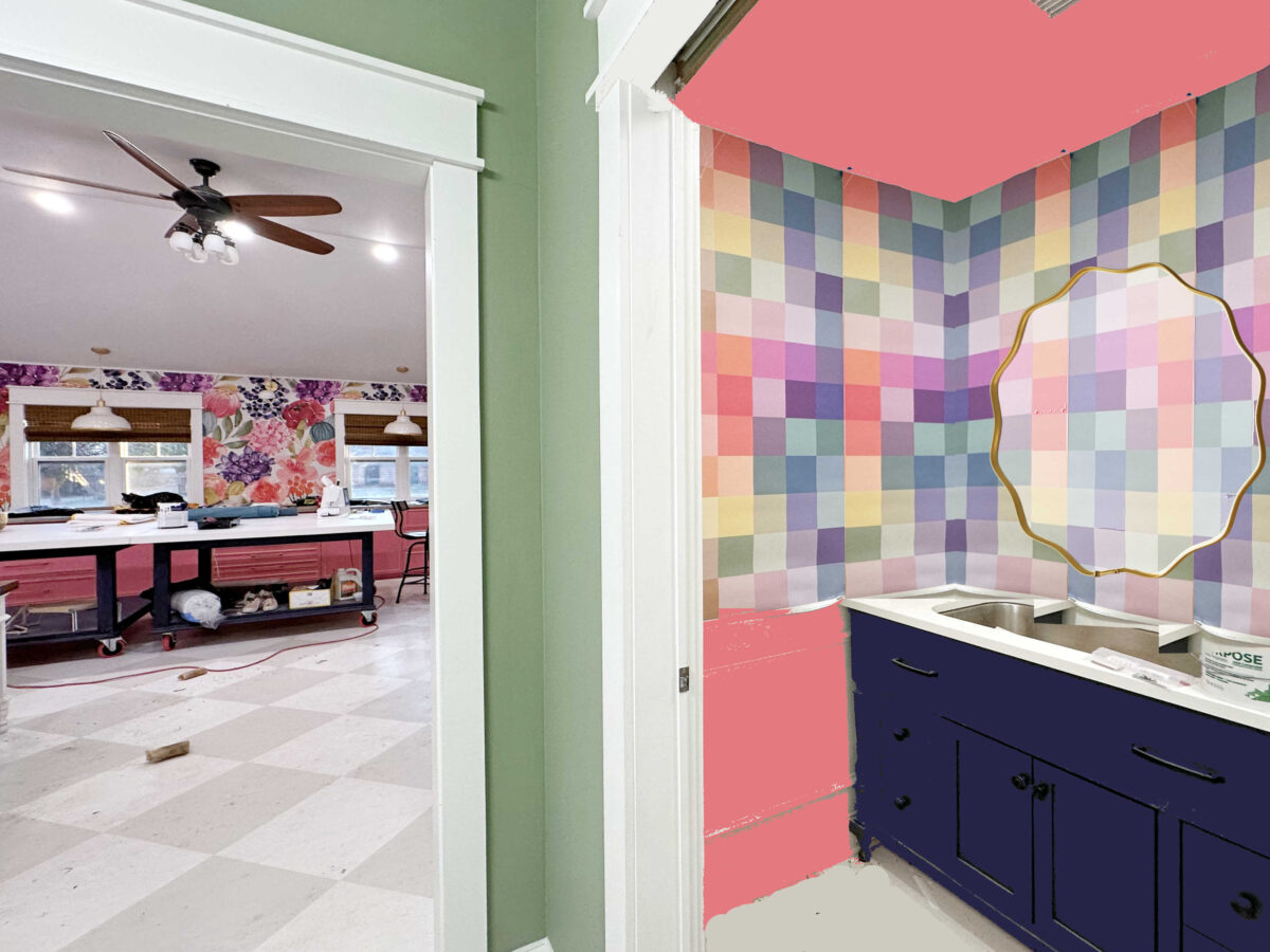 I see you want to keep the pink for the studio cabinets, but painting the vanity that color would help connect the half bath to the studio. That with the wallpaper on top and ceiling and wainscoting the same as the studio ceiling (did that stay blue or go back to white–I can’t remember) would look connected but it’s own space. Can’t wait to see what you decide.