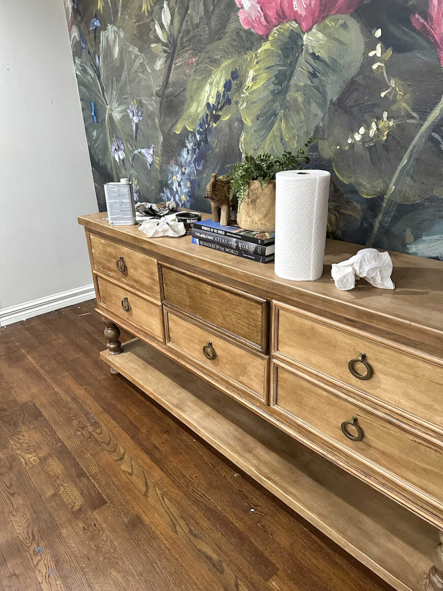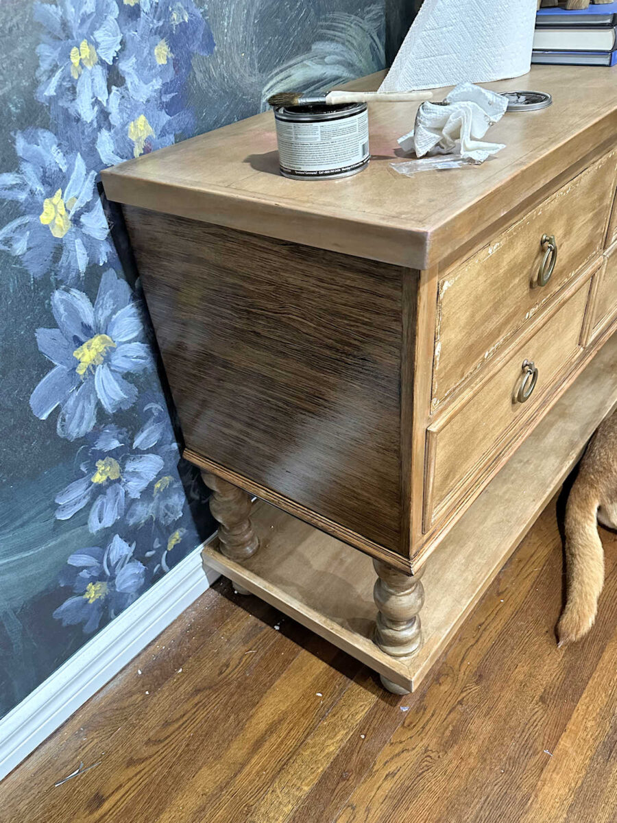 He suggested that I wipe the whole thing down with acetone to remove any excess wax, but of course, I was too anxious to try out the gel stain that I skipped that step. (I’m not the best at being patient and following instructions.) So I tried out the gel stain on the end of the console table. I wasn’t thrilled with it, but I figured that I just needed practice. What I did love is that this product is totally different from the gel stain I used years ago. It stays very workable for a long time. No quick drying. No stickiness. It’s very easy to use.
