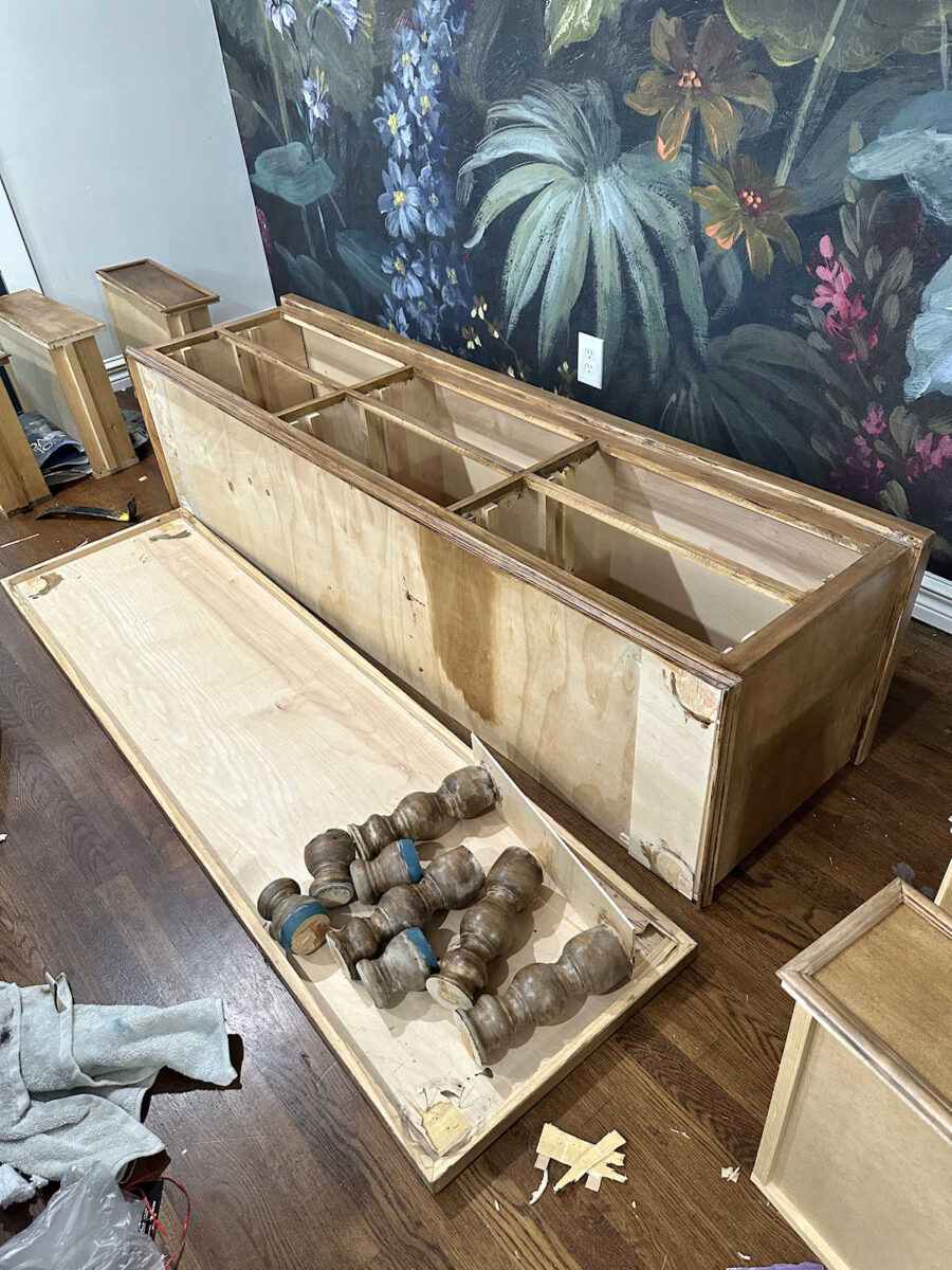 Basically, I’m making this up as I go along. I have my doubts that four turned wood legs on their own will be strong and stable enough to hold the weight of the console with the drawers, so I might try to design a totally new base that has more support.