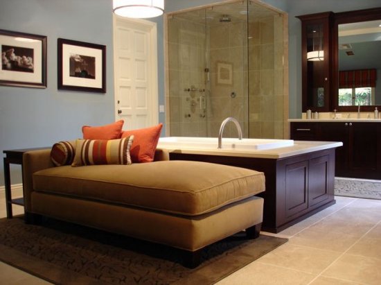 Beautiful work!! I’m quite certain that I would be very comfortable in any of those rooms. Heck, I could even hang out for a few hours in that bathroom!! There’s a huge t.v. on the wall that the tub faces.