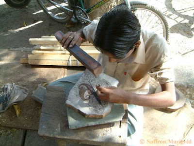 A master carver or his apprentice uses chisels and hammers to carve the intricate patterns into the blocks of wood.