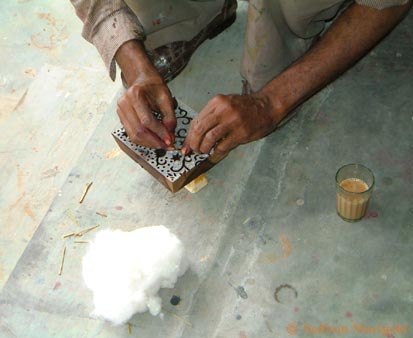 Next, holes are drilled into the carved blocks and stuffed with bits of cotton to ensure that the color will be distributed evenly.