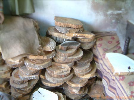 Have you ever heard of block printing? I had heard of it, but I don’t think I ever realized just how much work goes into block printing. It all starts with these slices of shesham wood.