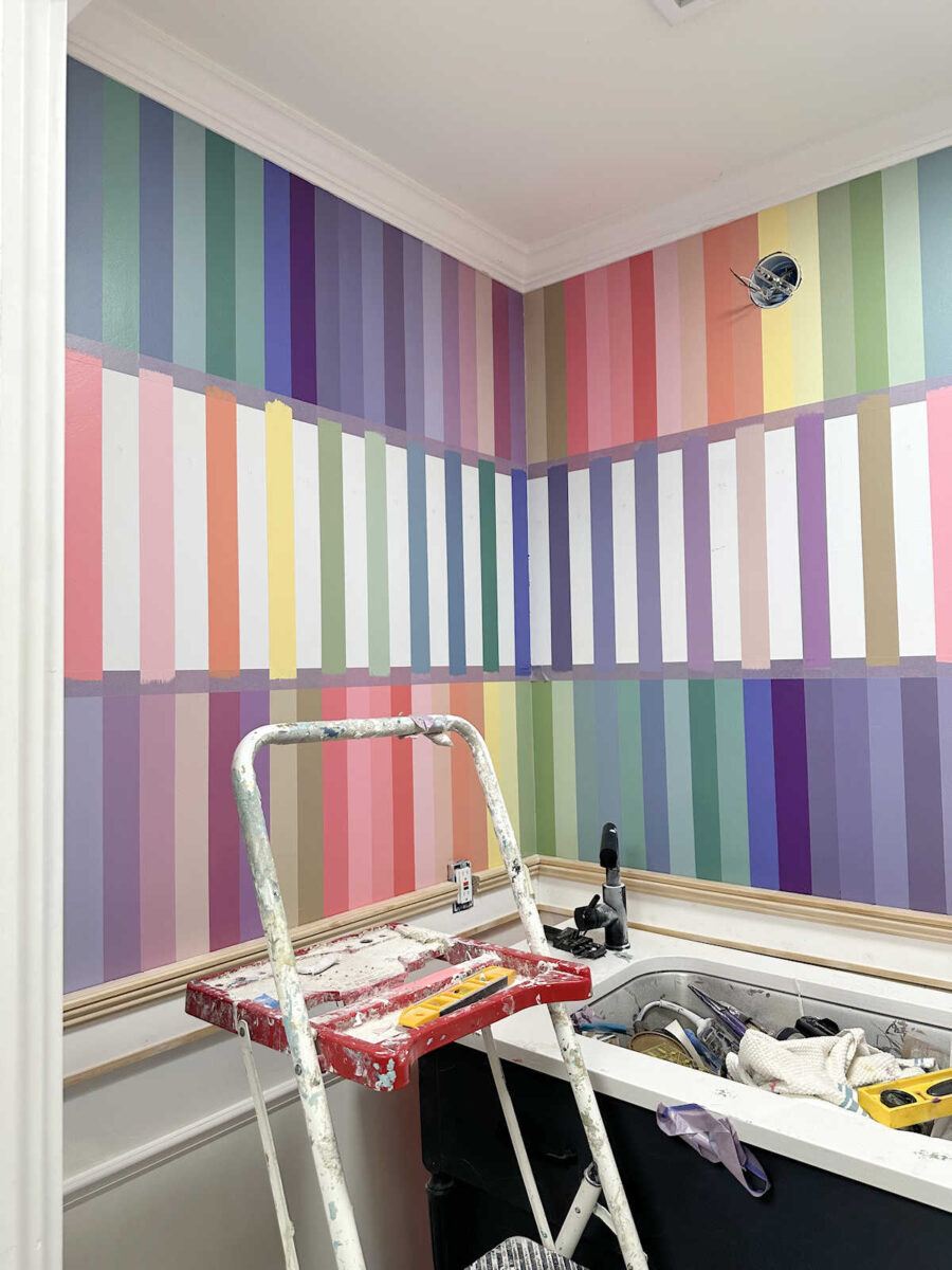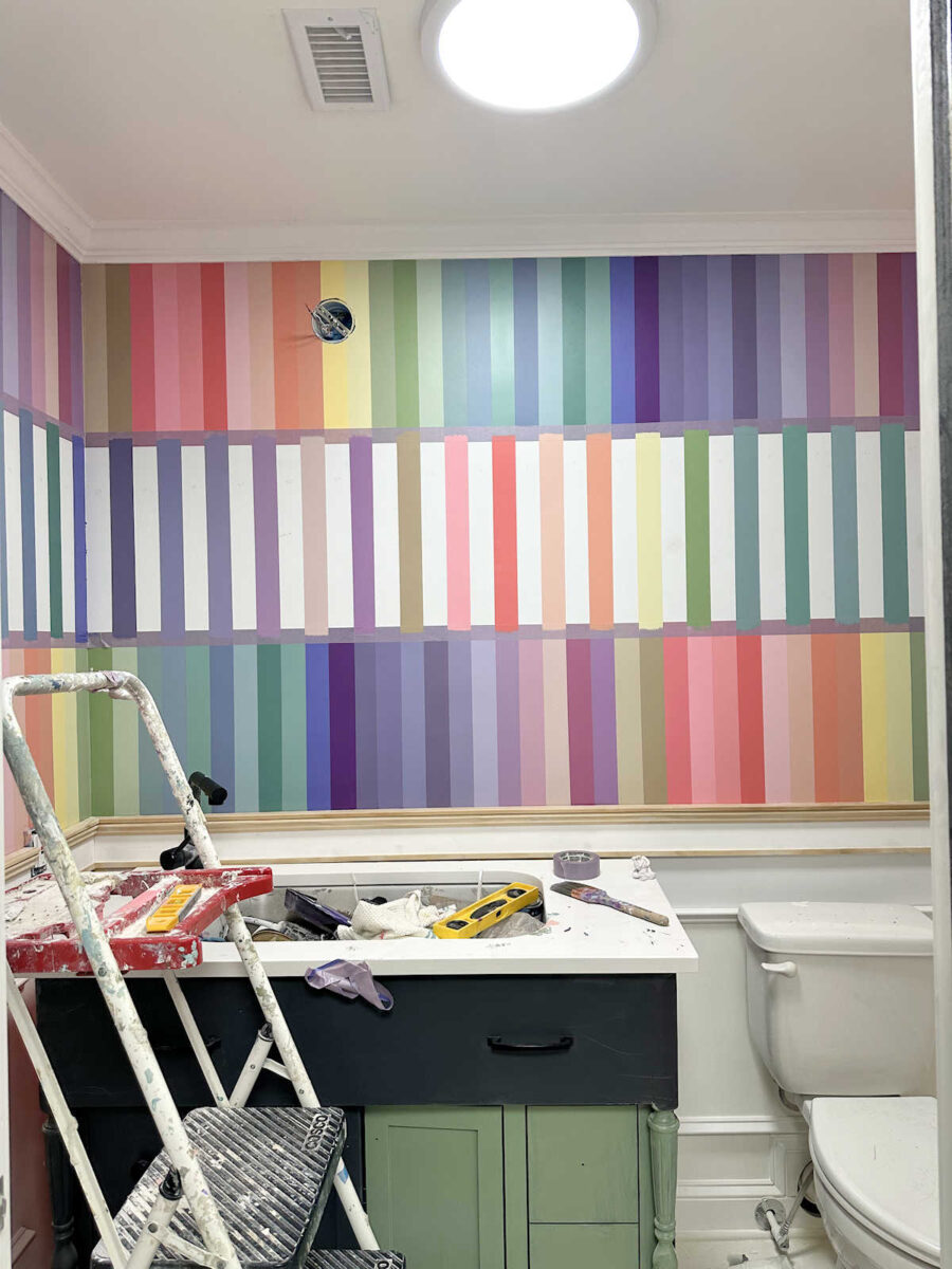 Kristi, you are the little engine that could and does and doesn’t stop. You are an amazing artist and I love this bathroom. Slow and steady wins the race, so keep on keeping on. I know this sounds strange, but the room seems very calming to me, I love the rainbow of colors, and it just feels peaceful, which is something I wouldn’t think could happen with all those stripes, but they don’t feel like stripes.