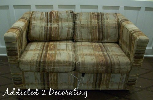 But just to show you that I haven’t completely lost my mind, let me show you what potential this little thing has. Here is a loveseat that has the exact same shape…minus the brittle, crunchy fabric. It’s amazing what new fabric and foam can do, huh?