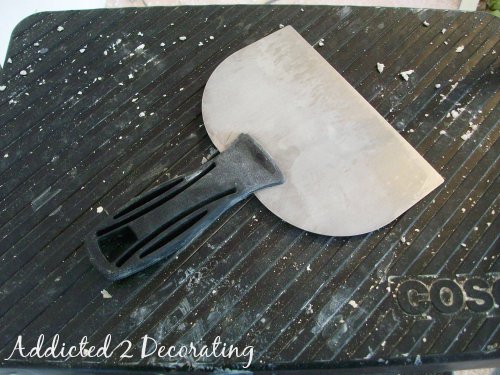 Yep, that’s it. A scraper (which costs about $4.50 at Home Depot), and a ladder. Of course, you’ll also want to wear a mask and eye protection. But then just start scraping…that’s all there is to it! The good thing is that this works on unpainted texture AND painted texture. Sure, it’s still messy, but you can vacuum it right up since it’s all dry dust.