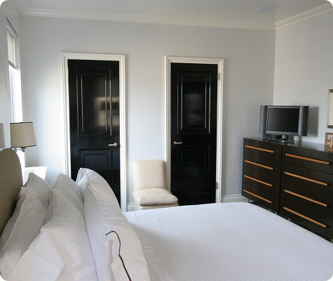 The black doors look sleek and classy. It looks fabulous against the pastel colored walls. Love that fabulous pendant light in the bathroom as well.