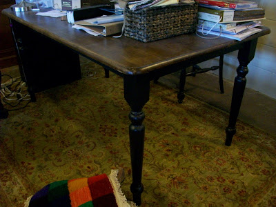 Table measures approx. 60″ x 36″, top is dark stain, apron