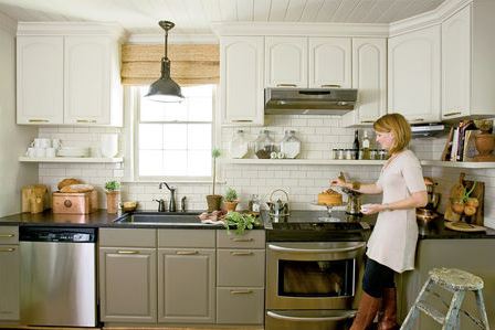 I have a light speckly grey countertop and black/clean steel appliances. My cabinets are a yellowy shade of light grain hickory. Part of me really likes the natural wood (perhaps stained a bit darker) but I have been SERIOUSLY contemplating going grey as opposed to stained, at least on the bottom. I think a dark-ish grey would really balance out the dark appliances in my little kitchen. You have gathered sooooo much great inspiration here. I will definitely be bookmarking this post.