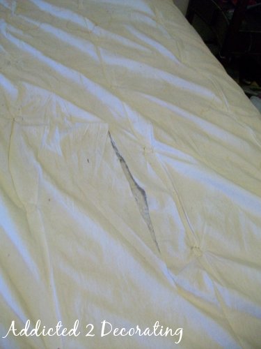 And then there’s our sad duvet. I’m ashamed to admit that we’ve had this since we got married eight years ago. At one point it had a duvet cover on it, but I got tired of messing with it and just took it off. (I’m not a huge fan of duvet covers on beds that are used regularly). This pathetic duvet has definitely seen better days. It has a huge rip in it, plus spots where we’ve spilled drinks, where I’ve dropped makeup on it, a huge spot where a bottle of Windex tipped over and leaked. Yuck.