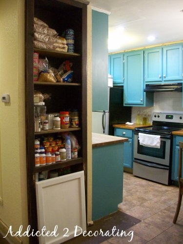 The biggest project will be this bookcase-turned-pantry. A person sees it as soon as he steps in the front door, and it needs to be dealt with!! I have the original door that goes on the bottom portion, and I want to have two additional doors made to cover the top portions. Then it needs to be painted to match the kitchen cabinets.