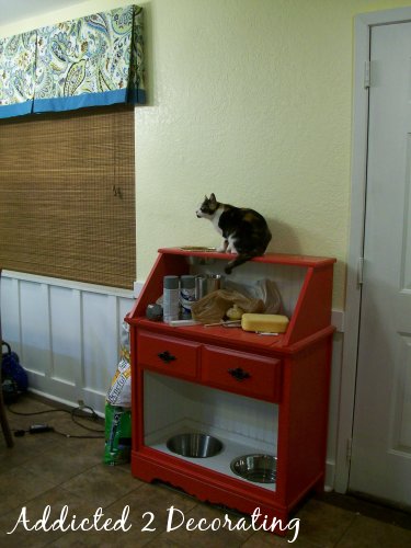 The pet station still needs to be painted. I’m tired of looking at this red!! I also need to stop using the cat bed section as storage for random items, and give my cats their bed back. 🙂