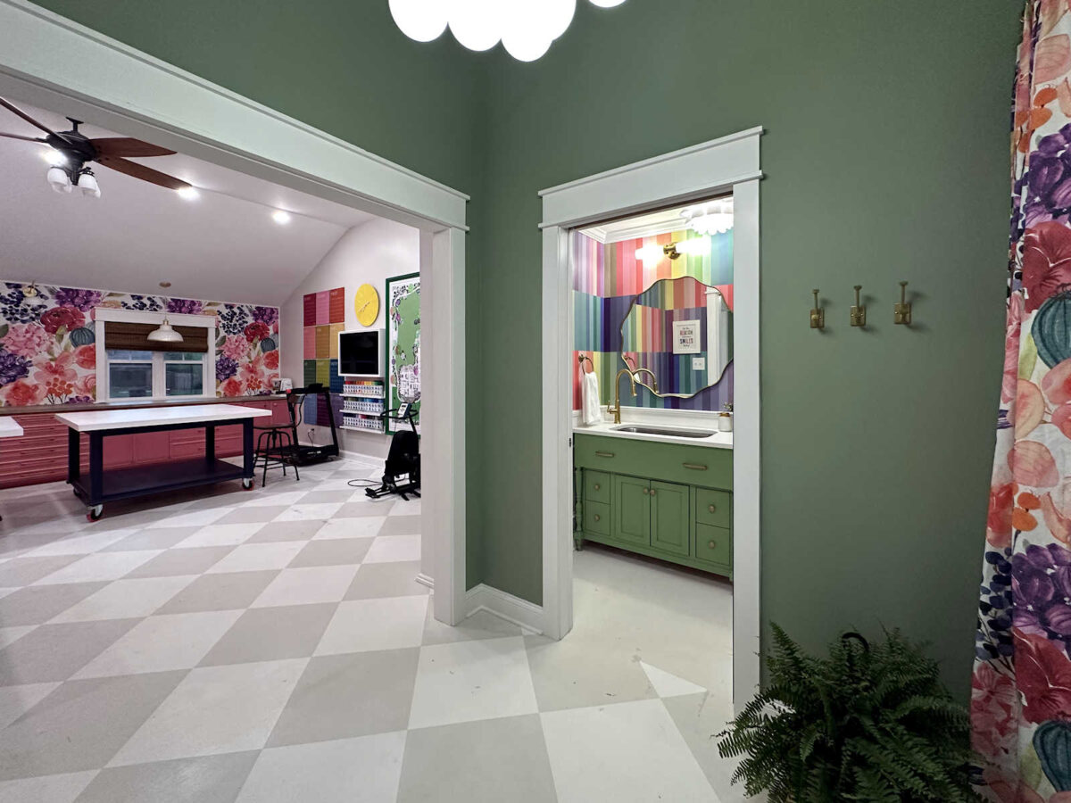 Good morning, y’all! This is a crazy week (as I mentioned last Thursday), and I wasn’t sure if I’d even be able to show up at all this week. But I just happened to get my studio completely cleaned and snap some new pictures of the whole finished studio that includes the newly finished studio bathroom. So I wanted to give y’all a new “tour” of the studio that includes the bathroom. All of these new pictures focus around the bathroom — the view from the rest of the studio into the bathroom and the view from the bathroom to the rest of the room. So if you want to see more detailed photos of the actual studio, you can see those here.
