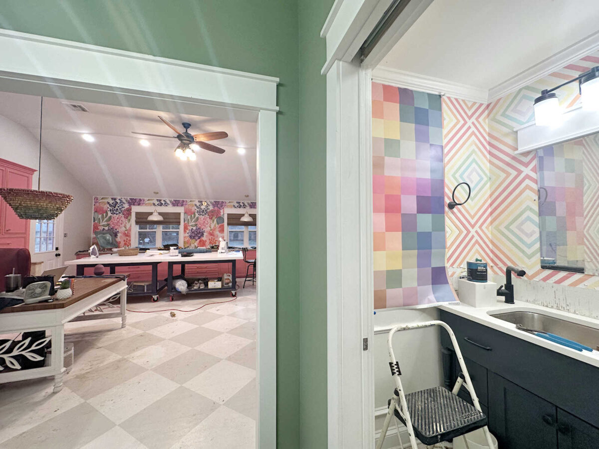 I’m wondering if you already have all the wallpaper you need for the bathroom. I don’t remember if you purchased just enough to test it. If you do need to purchase more, perhaps you could consider a smaller scale. Maybe even lean more towards a gingham design which would add more white overall. Just a thought. Same colors, slightly different design than the cabinet doors in the studio.