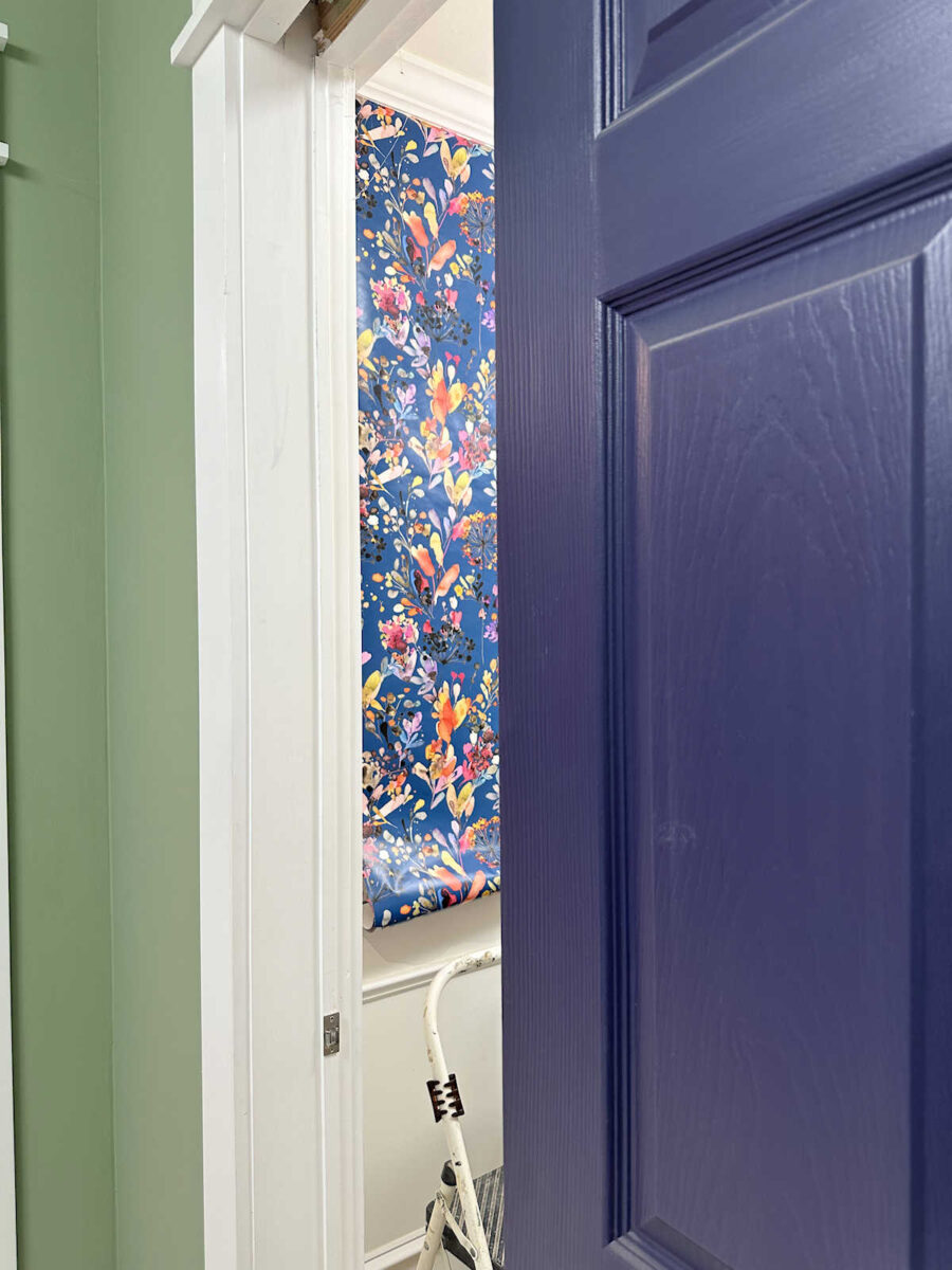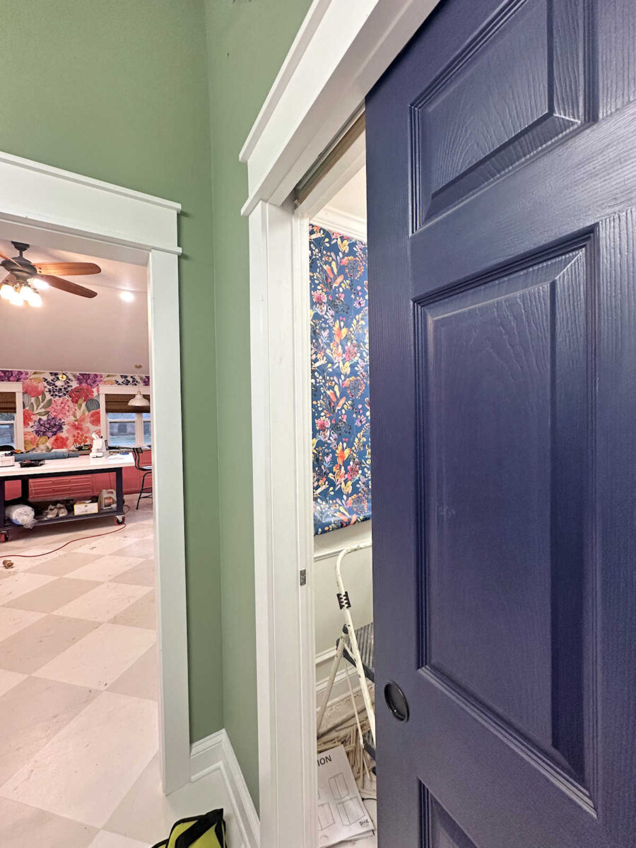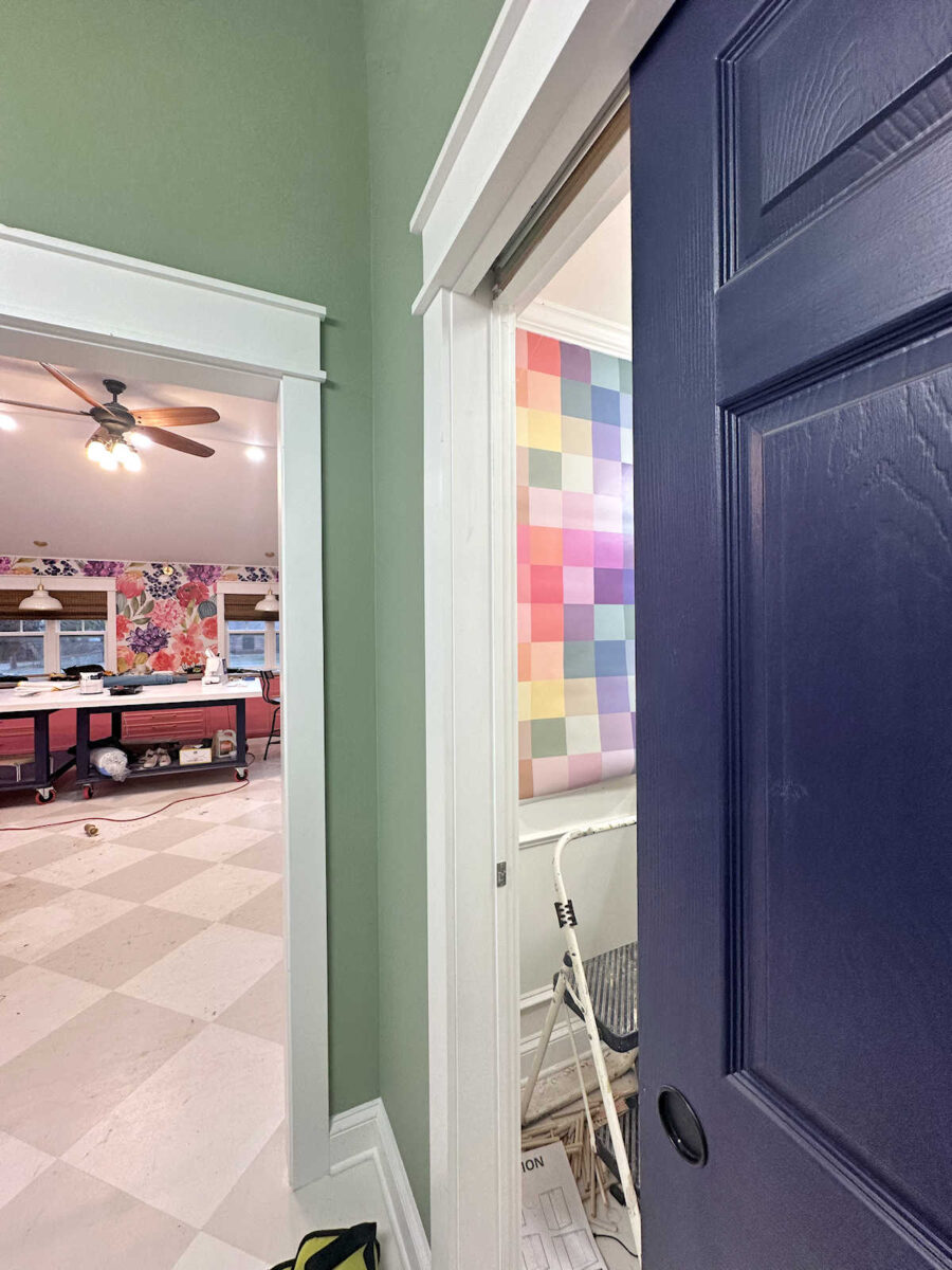 Again, I’m open to this idea, but I’m not sold on it. The doors to the bathroom and the storage closet in this back entry of my studio are painted a deep eggplant color. And one thing I don’t want is for my wallpaper decision to start the ball rolling on other changes. I want to avoid the whole “one thing leads to another” trap (aka, the “if you give a mouse a cookie” trap). And I don’t love the dark eggplant doors with this wallpaper.