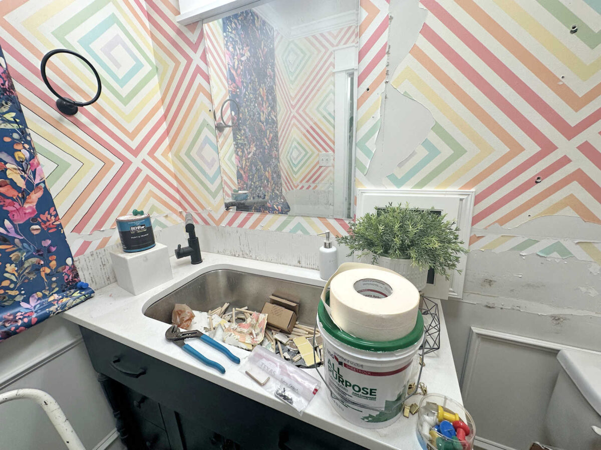 I’ll need to do some repair on the walls with drywall mud. That’s really the hardest part. Once that’s done and the walls are smooth again, I’ll install wallpaper, add some trim, change out a few things (new faucet, new ceiling light), and then add a few decorative touches.