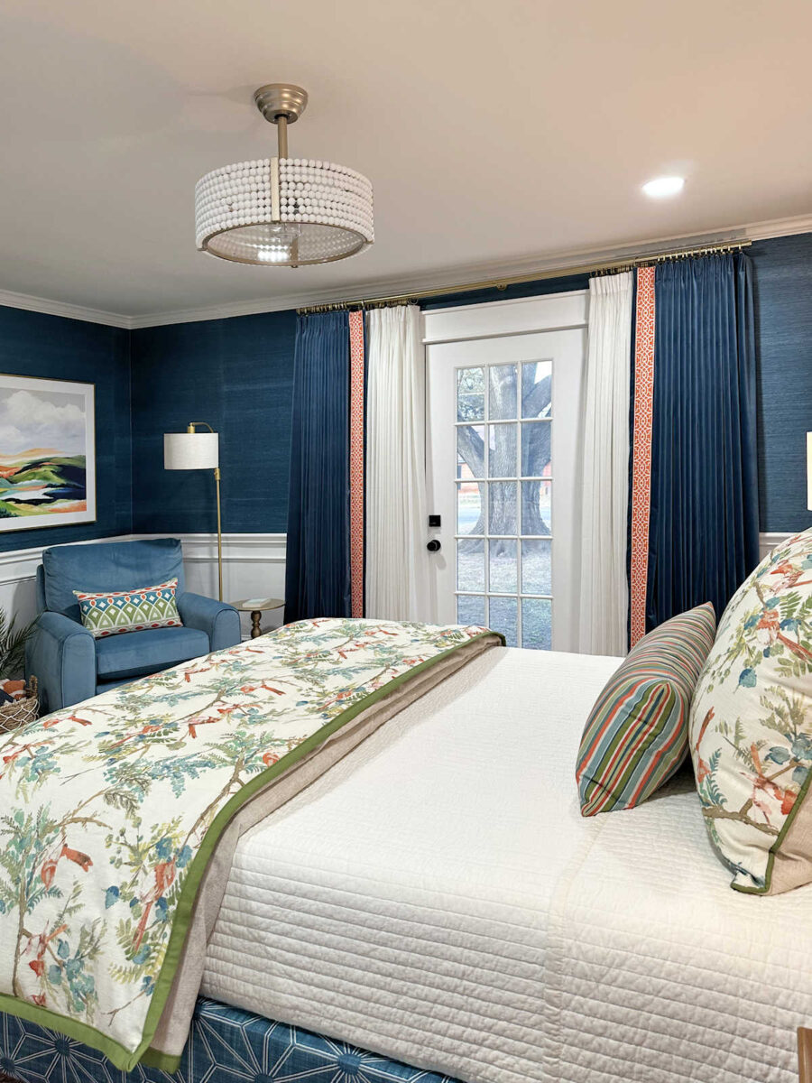 It really is a lovely bedroom. I love the color choices, patterns and textures you chose. the only thing that still throws me off (and this is purely my own viewpoint, so I hope it doesn’t offend!) is the weight visually of the drapery on the door. I think there is too much fullness. The door isn’t wider than the windows (unless it’s a few inches) yet there is double the fabric. As I’ve said, this is my opinion, and you can totally ignore it! The rest of the room is beautiful!