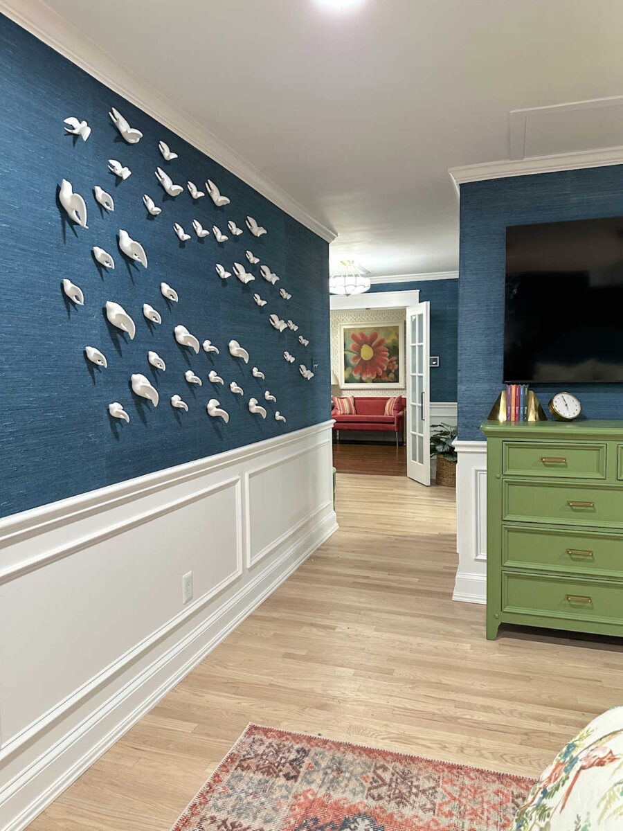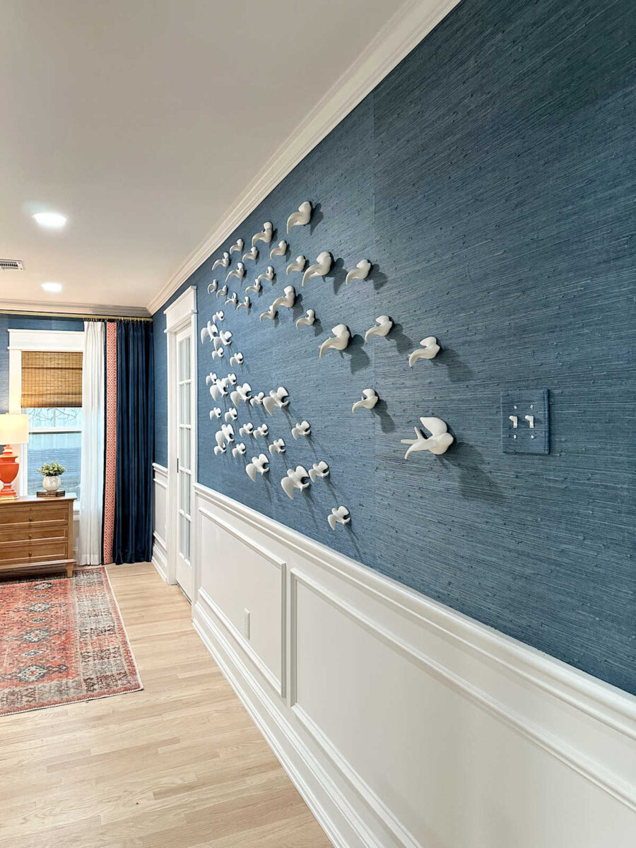 The ceramic birds are from Amazon (affiliate link), and I love birds, so I used a whole lot of them and created a freeform wall installation with them.